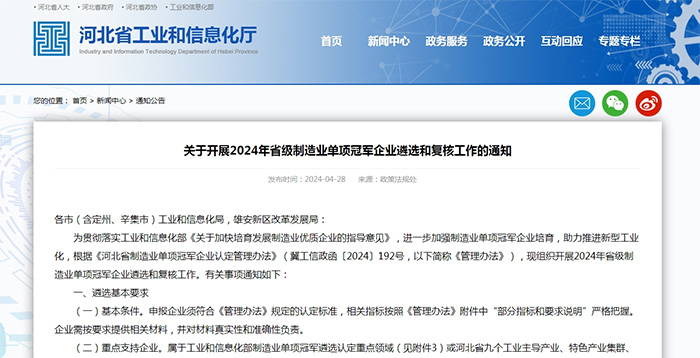 據(jù)介紹,河北省制造業(yè)單項(xiàng)冠 軍企業(yè)旨在表彰長(zhǎng)期專注于制造業(yè)特定細(xì)分領(lǐng)域,創(chuàng)新基礎(chǔ)條件和技術(shù)創(chuàng)新能力優(yōu)異,生產(chǎn)技術(shù)或工藝水平達(dá)到國(guó)際先 進(jìn)國(guó)內(nèi)領(lǐng) 先水平,單項(xiàng)產(chǎn)品市場(chǎng)占有率位居全 球或全 國(guó)前列的企業(yè)。