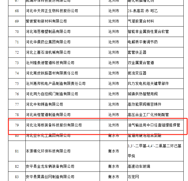 近日,河北省工業(yè)和信息化廳公布了《關(guān)于第六批河北省制造業(yè)單項(xiàng)冠 軍企業(yè)通過復(fù)核的第三批省級(jí)制造業(yè)單項(xiàng)冠 軍企業(yè)名單的公示》,河北滄海核裝備科技股份有限公司的“油氣輸送用中口徑直縫埋弧焊管”成功入選名單,彰顯了滄海核裝持續(xù)推進(jìn)企業(yè)高質(zhì)量發(fā)展結(jié)出的豐碩成果。
